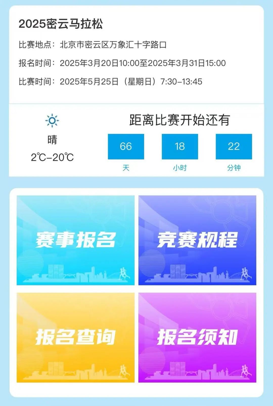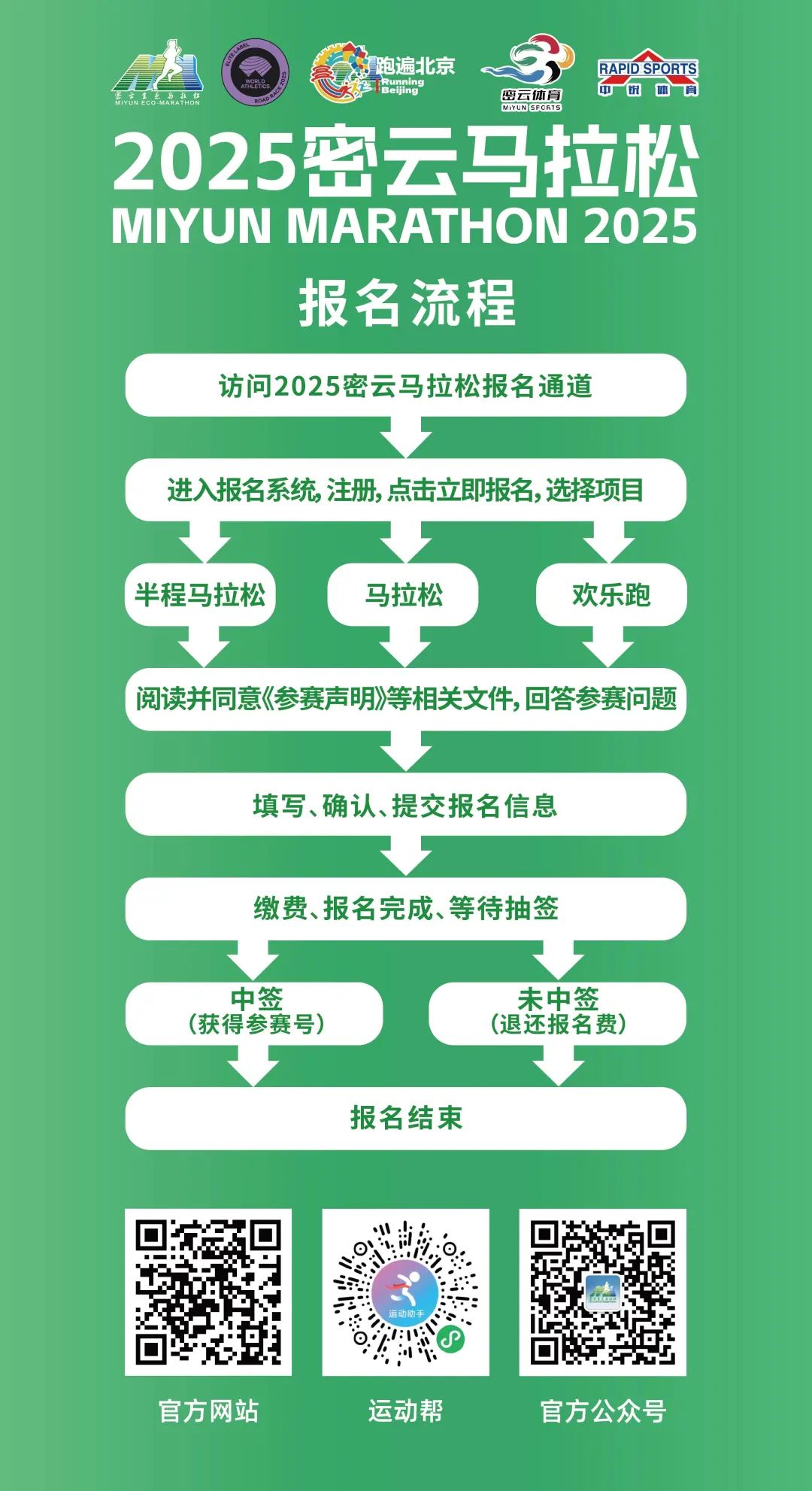 或关注「密云生态马拉松」微信公众号/小程序、运动帮助手小程序、马拉马拉app找到赛事报名入口。